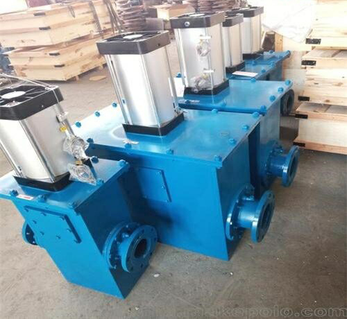 安裝在料倉頂部,作為輸送管線料倉間切換之用,具有切換方便,密封性好,結構緊湊,占地空間小的優點,是氣力輸送系統中重要的部件。庫頂切換閥采用沖氣式密封圈,,閥門啟閉時,閥芯與密封圈之間無接觸,當閥門切換完成后,密封圈充氣實現彈性變形進行密封。該閥設有到位開關,并可將開關信號送入PLC,進行遠程控制;密封圈具有檢測壓力開關,可智能檢測密封圈是否失效破損;該閥采用氣缸驅動,切換方便迅速。