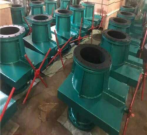 其結(jié)構(gòu)與工作原理同上管夾閥。當(dāng)順轉(zhuǎn)手輪時(shí),使大小閥桿同時(shí)帶動(dòng)上下閘板,壓縮管套,進(jìn)行關(guān)閉,反轉(zhuǎn)即行開啟,這樣,閘板在導(dǎo)柱之間上下往復(fù)完成閥門開閉工作。另外,因橡膠管套承力,因此在開關(guān)時(shí),操作人員旋轉(zhuǎn)手輪時(shí)只要感到適量抵觸,均己達(dá)到開閉極點(diǎn),切勿盡力或多人輔助,禁用其他工具開閉。