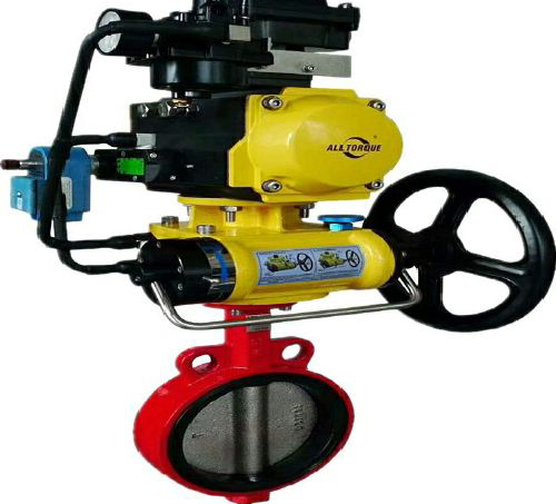 4、安裝完畢后,對WD671X16-氣動蝶閥進行調試(正常情況下供氣壓力為0.4~0.6MPa),調試運行時須手動操作電磁閥啟閉(將電磁閥線圈失電后手動操作方可有效),觀察WD671X16-氣動蝶閥的啟閉情況。如果在調試運行過程中發現閥門在啟閉過程初始時有些吃力,之后正常,則需要將氣缸行程調小(把氣缸兩端行程調節螺絲同時往里調一點,調整時需將閥門運行到開位置,然后將氣源關掉再調),直至閥門啟閉動作順滑且關閉無泄漏。還需要注意的是,可調型消音器可以調節閥門的啟閉速度,但不可調得過小,否則可能引起閥門不動作。