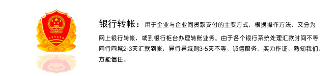 再我公司采購產品的客戶請按以下官方指定途徑匯款,非以下途徑匯款引起的任何糾紛由匯款單位自負。首次交易的新客戶或開票信息、收貨信息有變化的老客戶請提供最新開票信息、收貨信息(收貨地址、收貨人、聯系電話)。以上企業匯款賬號、快捷途徑轉款卡號、微信二維碼掃碼支付、支付寶二維碼掃碼支付是我司官方指定公開匯款方式,除此之外的賬號與卡號都需經過企業加蓋公章確認,否則無效。